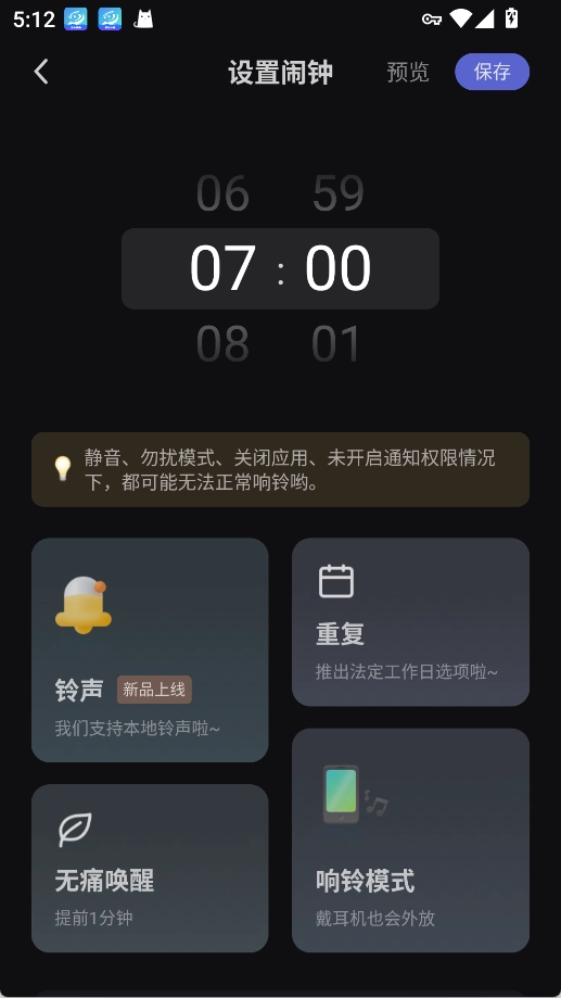 按照自己的作息习惯,设置好时间和提醒方式,就能完成闹钟的配置了。
