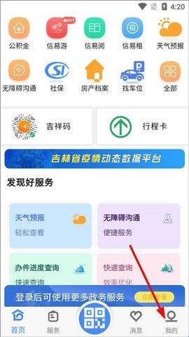 用户访问本站并完成灵动长春相关操作后,会直接进入首页面,在该页面中,用户可查找对应的工具按钮,之后点击下方的“我的”选项。