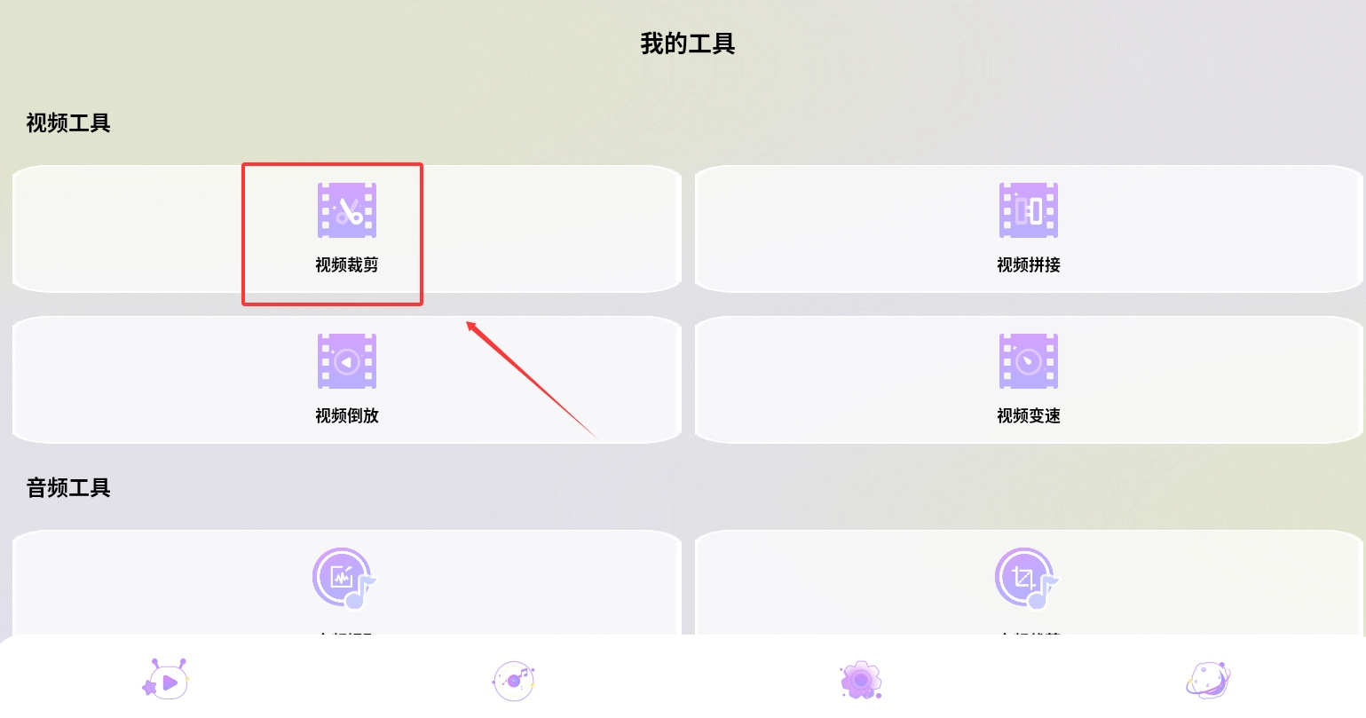 进入我的工具页面,就能进行视频裁剪、拼接等制作操作,只需按顺序点击即可完成。