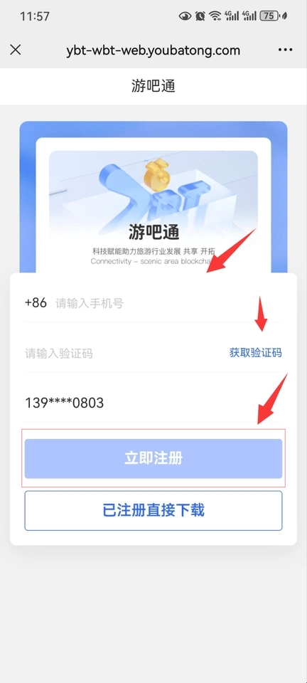 1:使用手机微信或浏览器打开扫一扫功能,输入本人手机号后点击获取验证码,待手机收到验证码并输入后,点击立即注册即可。