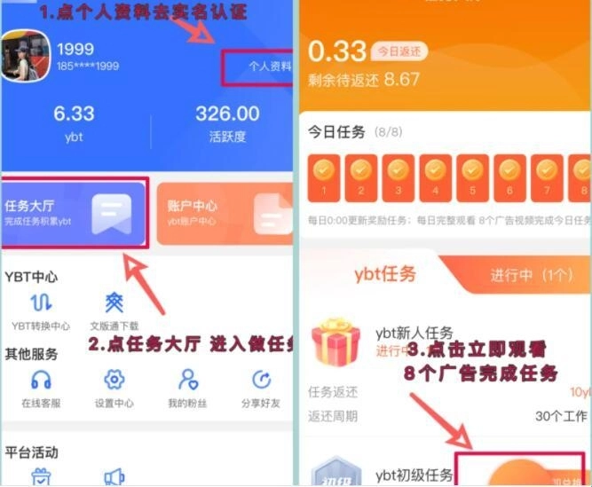 2:成功登陆游吧通后,点击“我的”进入个人中心,再选择“个人资料”完成实名认证。(之所以需要实名认证,是因为游吧通作为涵盖旅游线路报名、车票预订、酒店预订等功能的生态平台,所有服务均需实名制才能使用)。认证通过后,返回点击“任务大厅”,新注册用户会自动获得平台赠送的YBT新人任务包和新人茶山任务,领取任务后点击“立即观看”,每天完成8个视频观看任务就能获取积分奖励!