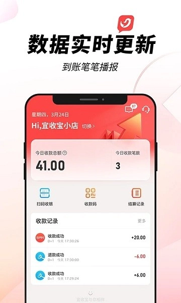 宜收宝最新版本是一款便捷实用的收款工具,支持多种支付收款方式,能让用户随时在线查看营业明细,还具备真人语音播报功能,功能全面且操作简单便捷!