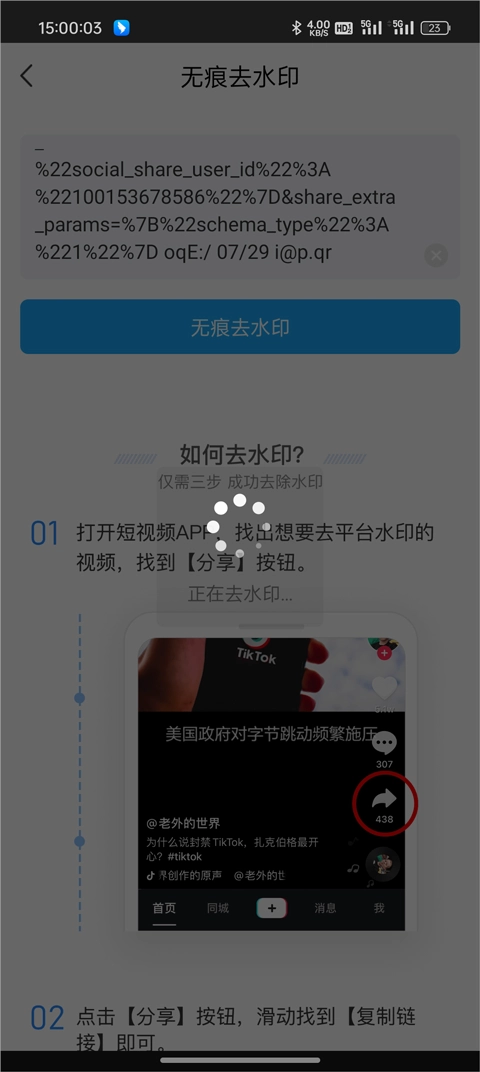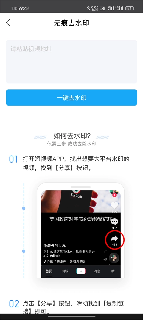 您可以先打开抖音,找到想要去除水印的视频,复制它的链接,然后把链接粘贴到对应的输入框里。