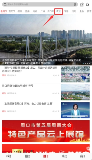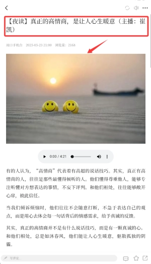 打开云上周口后,在首页导航栏里找到紫色的“夜读”标签,点击该标签就能进入晚间美文推荐专区。