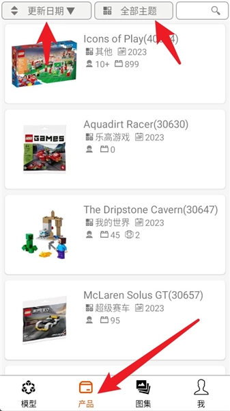 点击下方的“产品”按钮,就能查看全部乐高套装,还可以按照更新时间和主题进行快速筛选与浏览。