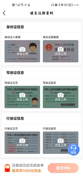用户按照平台的要求上传身份证、驾驶证、行驶证等相关资料就可以了。