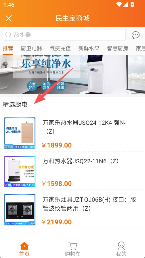 进入民生宝商城,选择精选厨电中的商品。