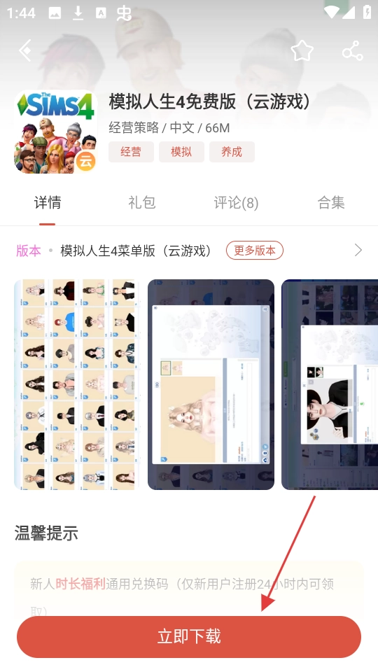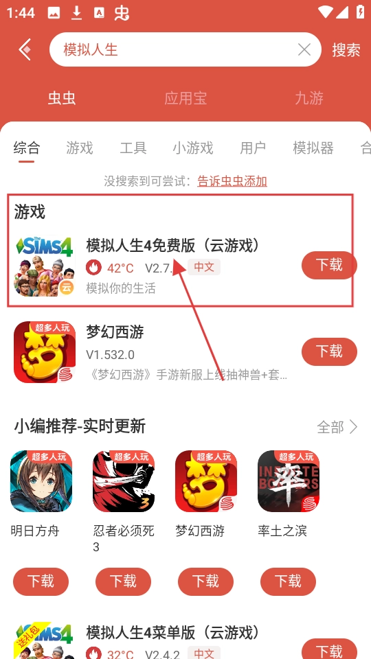 在搜索结果里找到你想玩的游戏,像“模拟人生4免费版(云游戏)”这类,点击该游戏条目即可进入对应的游戏详情页面。