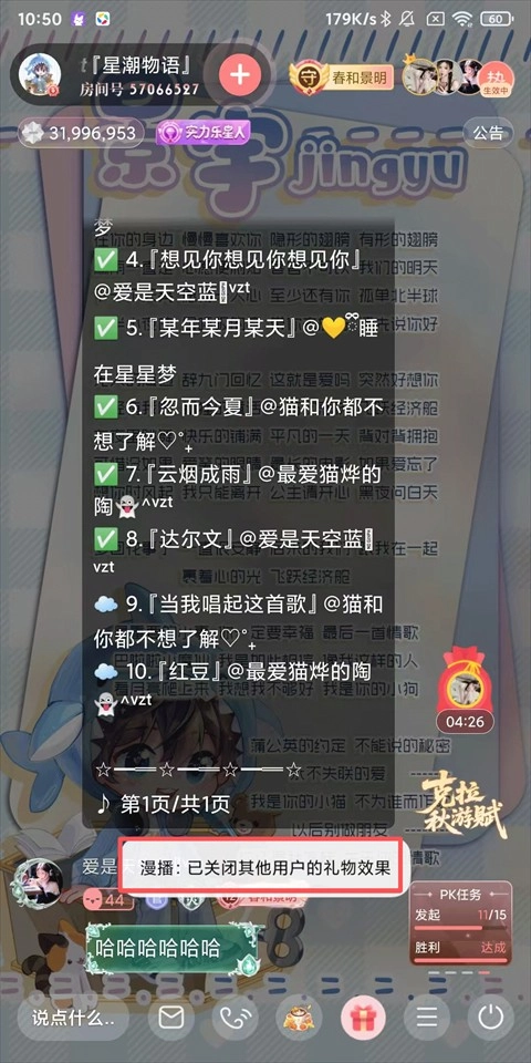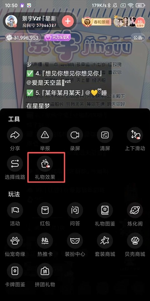 3、在弹出的快捷菜单中点击【礼物效果】即可关闭,再次点击开启;