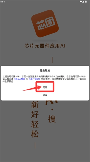 打开芯团应用,当出现隐私协议提示框时,勾选同意选项以继续后续操作。