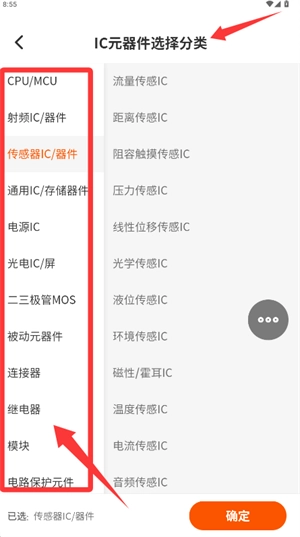 打开分类栏,在IC元器件分类里挑选需要的类别,比如传感器器件。