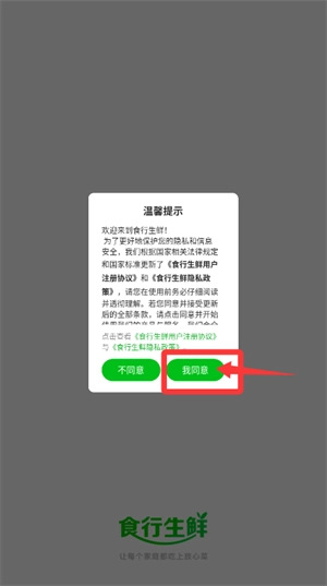 打开食行生鲜APP,当出现提示框时,选择“我同意”这一选项以继续后续操作。