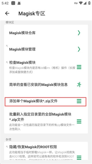 在【Magisk专区】里,您能够选择检查Magisk模块,也可以对这些模块进行管理,另外,您还能通过添加单个Magisk模块的*.zip文件来拓展系统的功能。
