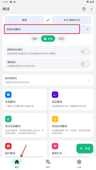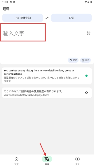 打开翻译应用后,点击底部的翻译选项,即可进入文字翻译的输入界面。