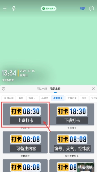 在考勤打卡模板里,点击上班打卡模板,就能进入水印编辑界面。