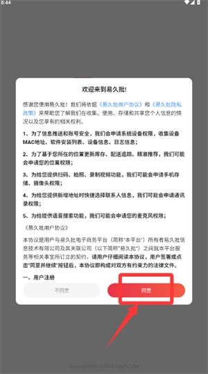 打开易久批应用后,在弹出的隐私政策提示框里选择同意选项,以便继续后续操作。
