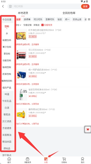 进入程序主界面后,点击底部的分类标签,再从左侧的侧边栏中选择你想要的商品类别。