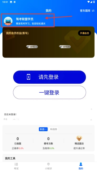 打开驾考联盟应用后,点击界面底部的“我的”按钮,即可进入个人中心页面。
