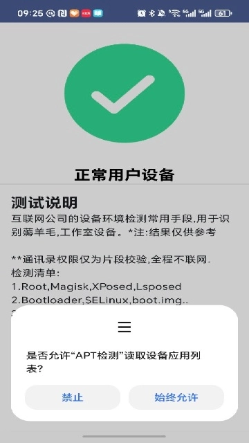 当弹出 “是否允许‘APT 检测’读取设备应用列表” 的权限请求时,你可以根据自身需求选择 “禁止” 或 “始终允许”,这样能保障检测功能的完整性。