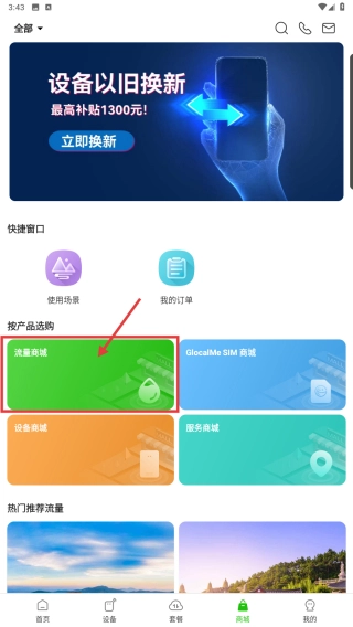 在商城页面,点击流量商城的入口,即可进入流量包的选购界面。