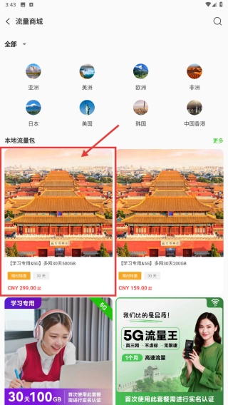 在流量包购买页面,查看本地流量包的选项,挑选学习专用的流量包。