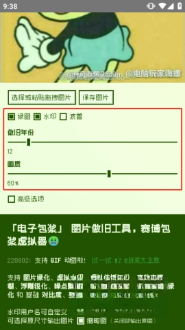 导入图片后,可借助下方的“绿图”“水印”“波普”等基本选项添加各类细节,还能拖动做旧的年份与画质设置,从而实现理想的做旧效果。