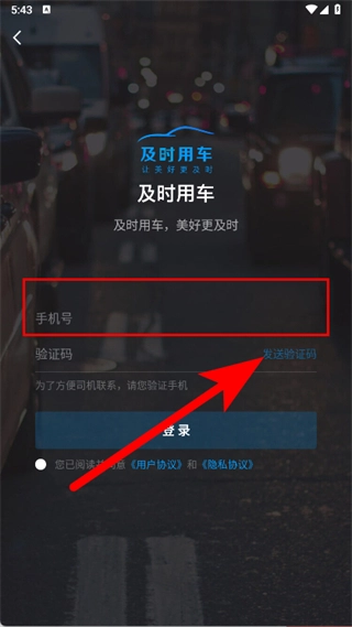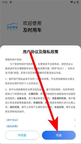 打开及时用车应用,待弹出相关窗口后,仔细阅读协议条款,确认无误后点击同意按钮。