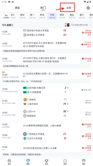 在赛程页面,选择全部分类,浏览全品类赛事列表。