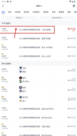 在NBA赛事详情页面,可查看具体赛事内容,比如25-26赛季季前赛的精彩回顾——火箭对阵鹈鹕,以此来了解相关赛事信息。