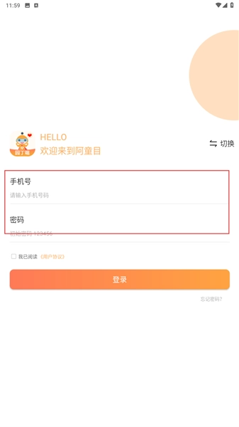 2、在登录页,输入手机号和账户密码,勾选下方用户协议点击登录。