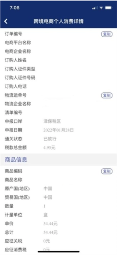 点击订单编号,即可进入跨境电商个人消费详情页面,在此能查看该票单据的通关状态、税款信息等详细内容。您也可以点击“物流运单号”右侧的“复制”按钮,前往快递公司平台查询物流进展。