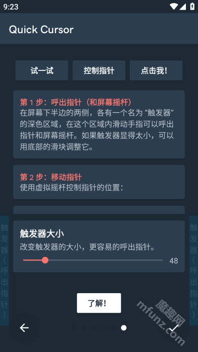 指针呼出与操作:在触发器区域内滑动手指可呼出指针和虚拟摇杆,用其控制指针位置并模拟点击,闲置几秒后摇杆自动隐藏。