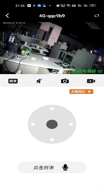 4.选择某个设备(如“4G-qqc9b9”)进入实时监控界面,可查看当前画面、调整画质(如“超清”)、开启/关闭声音、拍照或录像,并通过“点击对讲”与现场进行语音通话。
