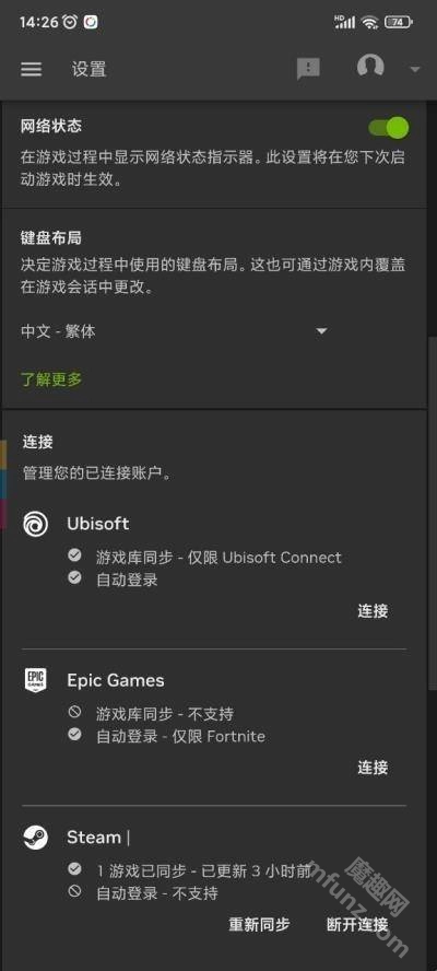 2、进入设置-连接,绑定游戏平台账号,支持Steam、Epic、育碧。