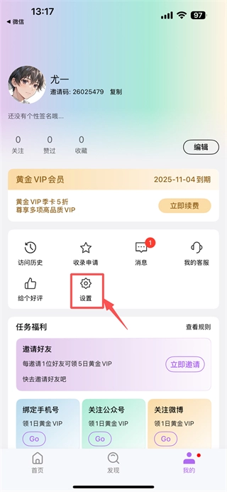 打开社交类应用的首页后,点击底部导航栏中的“我的”选项,即可进入个人中心页面。