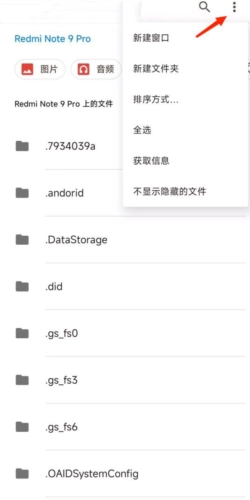 点击右上角的三个点服务,勾选显示隐藏文件。