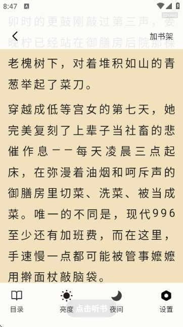 8.启动播放后,页面跳转至阅读界面,呈现小说正文内容,同时支持夜间模式切换、屏幕亮度调节、点击听书等功能;界面底部配备“目录”“设置”等选项,助力用户获得便捷流畅的阅读体验。