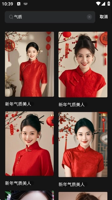 2.输入关键词“气质”并点击搜索后,页面显示多个与“气质”相关的图片模板,例如“新年气质美人”。这些模板以网格形式排列,用户可浏览并选择感兴趣的模板。