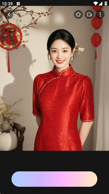 3.点击任意一张模板图片(如穿红色旗袍的“新年气质美人”),进入预览界面。此时画面全屏展示该图片,顶部有返回、收藏、评论和更多选项按钮,底部有一个渐变色条,可能用于下一步操作或加载。