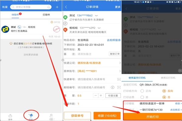 客户完成下单后,订单会同步至小哥收件端的【收件】页面。小哥收件后,需打开对应订单,在确认信息无误后点击“获取单号”,接着选择合适的打印机与模板,即可点击“开始打印”完成出单流程。