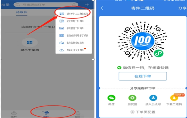快递员可在收件端【收件】功能的右上角点击“+”号,选择【寄件二维码】选项,系统随即生成寄件二维码。快递员将该二维码分享给客户后,客户通过微信扫描二维码就能进入下单页面,填写并提交寄件信息即可完成下单。
