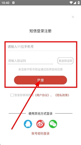 输入手机号码和验证码,点击登录按钮,即可完成账号登录流程。