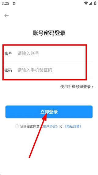 在账号密码登录页面,依次输入账号和密码信息后,点击“立即登录”按钮,即可完成账号的登录流程。