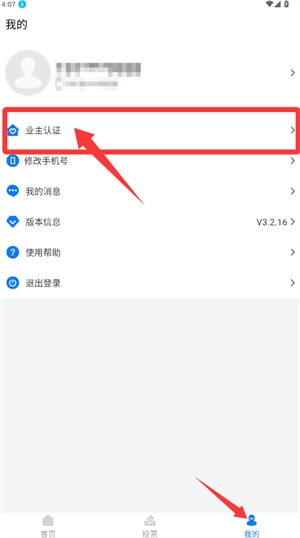 你可以在个人中心页面找到业主认证的入口并点击,这样就能进入身份验证的流程了。