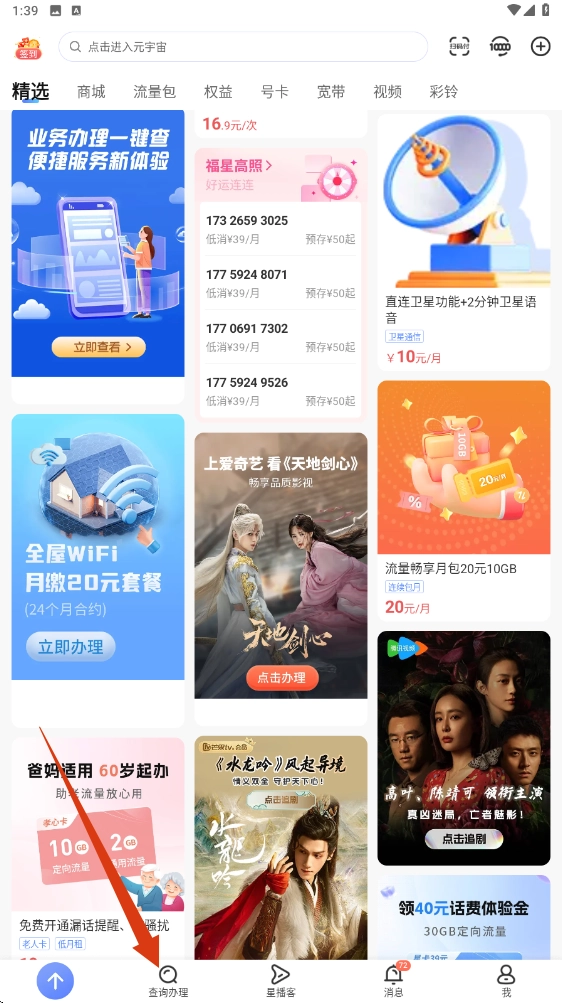 打开中国电信应用,点击底部的【查询办理】选项,即可进入专门的业务查询办理页面。
