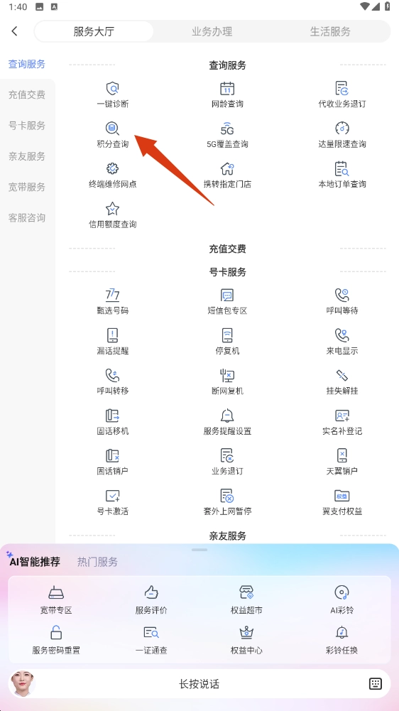 进入服务大厅后,找到【积分查询】选项并点击,就能进入我的积分页面查看积分情况啦。