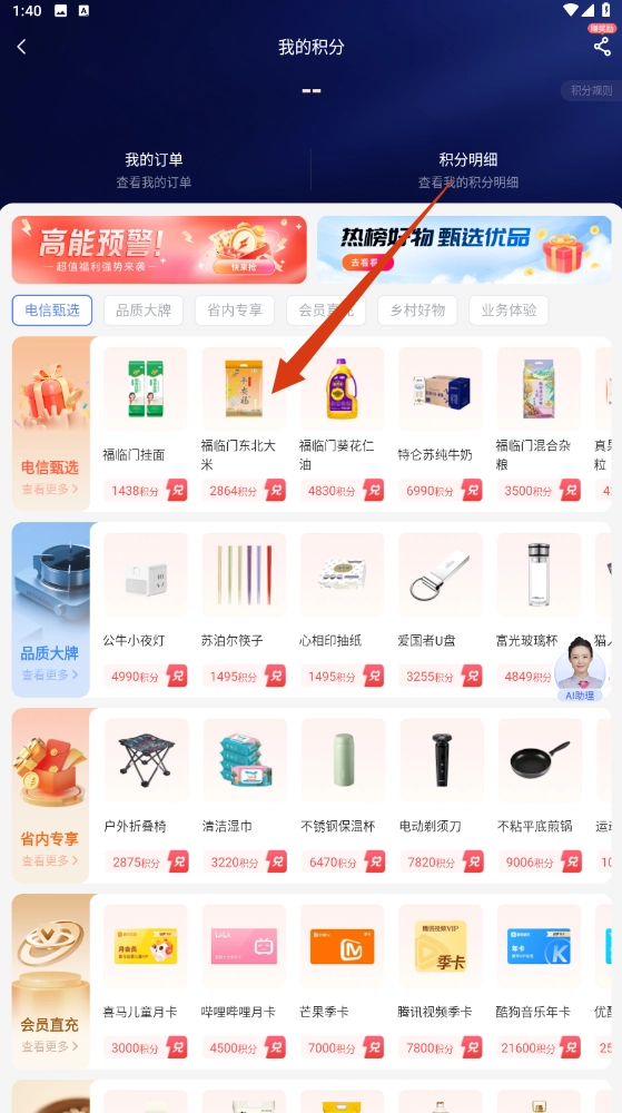 在我的积分页面,既能查看【积分明细】,还能浏览各类积分兑换商品,轻松了解积分使用方式哦。