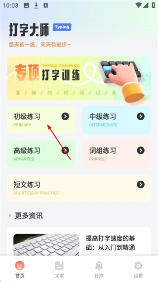 打开打字通后,点击“初级练习”选项,即可进入初级练习的内容列表页面。