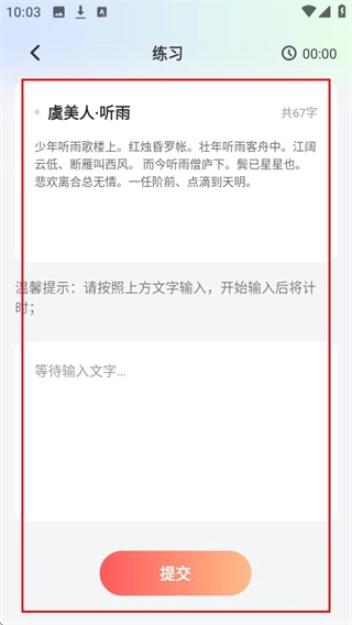 支持自定义练习内容,用户可以导入自己喜欢的文章、歌词等文本进行练习,这样既能兼顾兴趣又具有实用性。此外,还可以设置练习时长、字数等参数,方便用户利用碎片化时间进行练习。