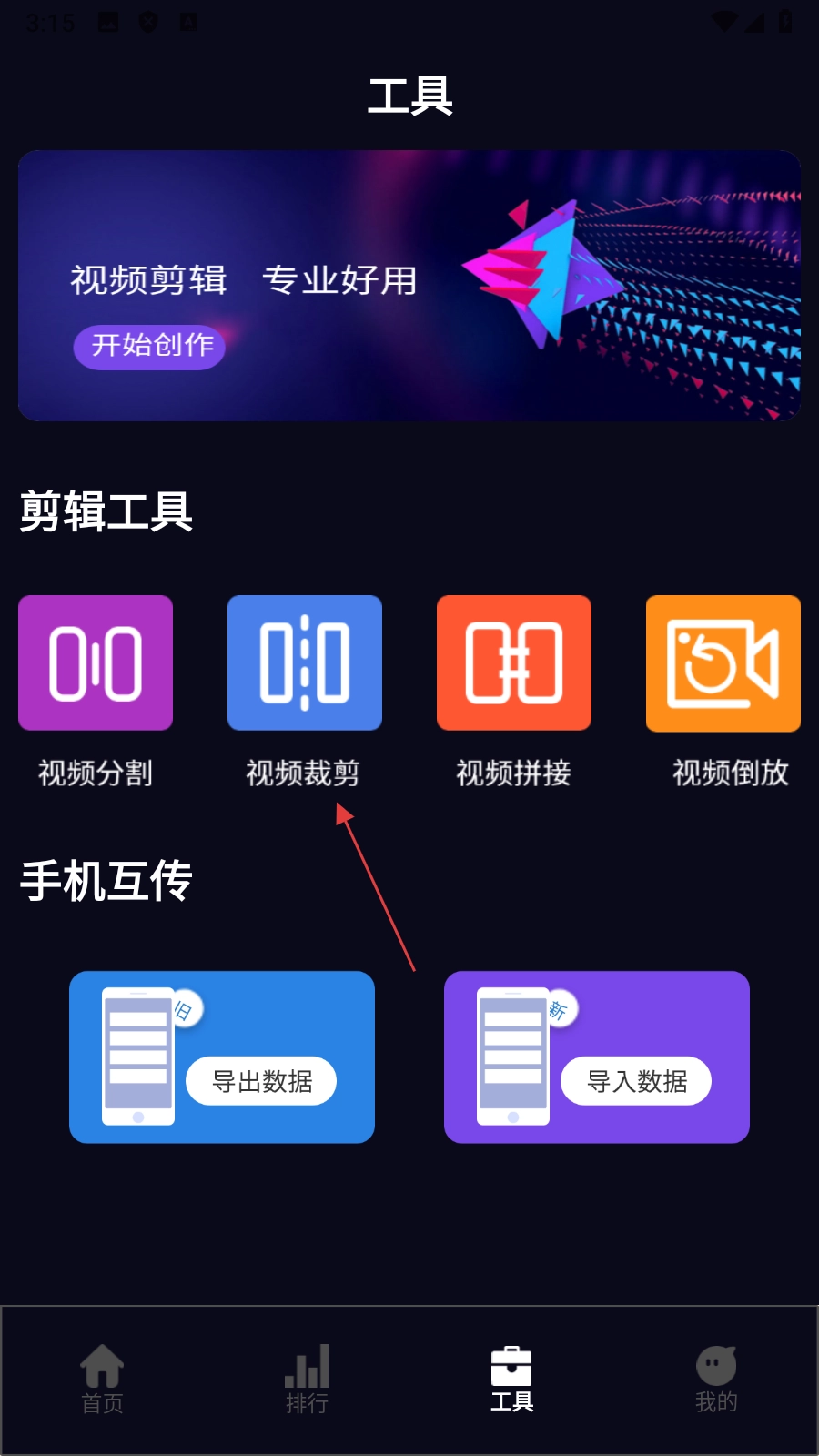 在工具功能页面,点击【视频裁剪】选项,即可进入视频选择页面。